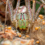 Solo las hembras presentan el famoso caparazón espinoso; los machos son pequeños, discretos y mucho menos vistosos. Tras la reproducción, la hembra deposita un ovisaco del que emergen diminutas crías que pronto comienzan a dispersarse.