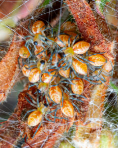 Decenas de pequeñas arañitas, recién emergidas, se agrupaban sobre la vegetación. Muchas personas me preguntan por qué las crías de esta especie se ven tan “panzoncitas”. La razón es sencilla y fascinante: